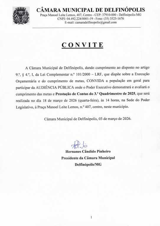 A Câmara Municipal CONVIDA a população em geral para participar da Audiência Pública do 3º quadrimestre de 2025.